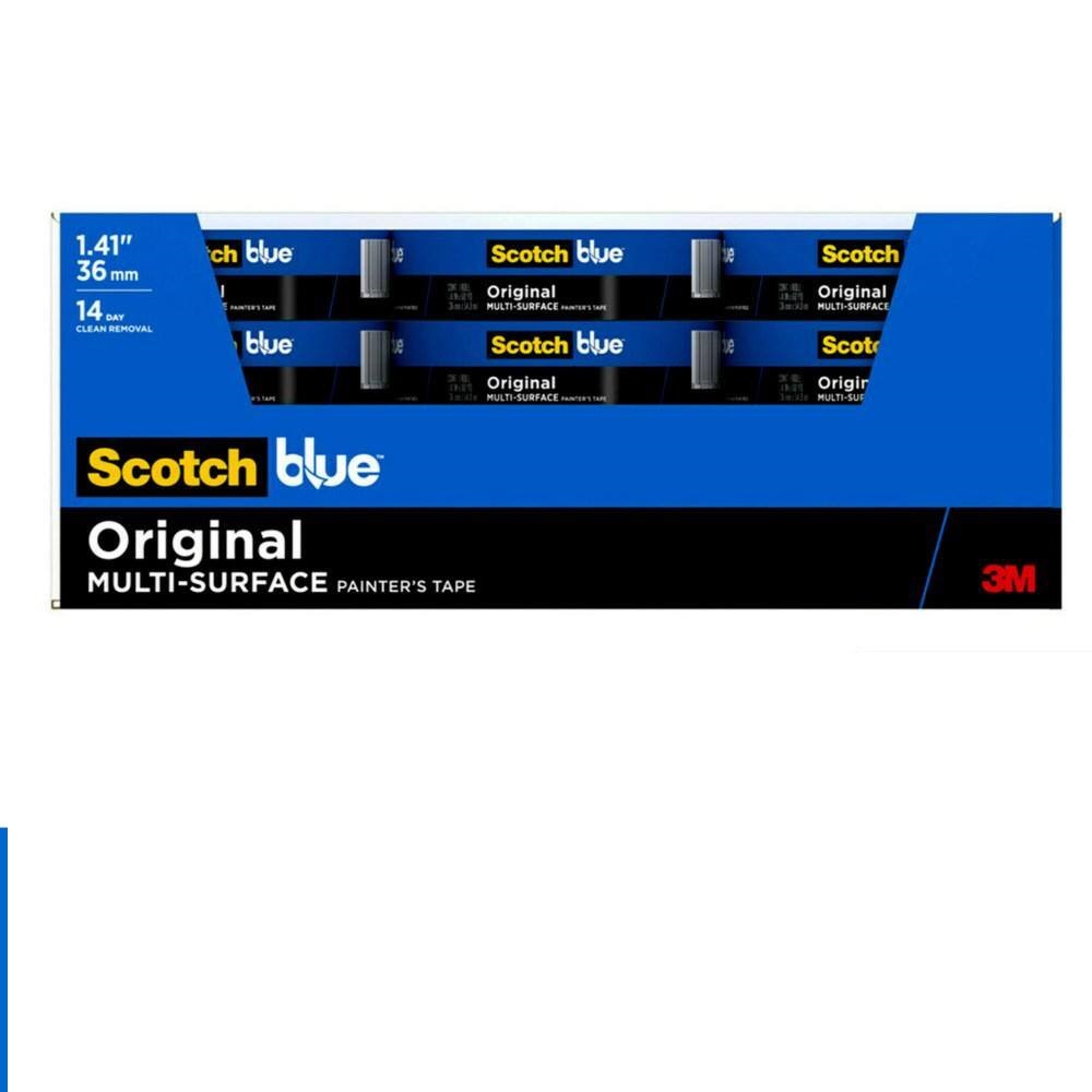 3M 2090-36NC ScotchBlue 1.41 in. x 60 yds. Original Multi-Surface Painter’s Tape (Case of 24) ScotchBlue Original Painter’s Tape is the tape that DIY painter’s and pros have loved for more than 30 years. Whether you’re protecting your wood trim, painted walls, tile floor, or glass windows, this versatile multi-surface tape can stay on surfaces for up to 14 days and then removes easily without leaving any sticky residue behind. Help protect your surfaces while bringing your creative vision to life with the help of ScotchBlue Original Painter’s Tape. USE-ON SURFACES: Designed for use on multiple surfaces such as smooth or lightly textured walls, trim, baseboards, tile, and glass DAYS CLEAN REMOVAL: 14-day interior and exterior clean removal leaves behind no damage or sticky residue ADHESIVE LEVEL: Medium PERFORMANCE: UV and sunlight resistant SIZE: 1.41 in. x 60 yd PACK OUT: 1 Roll/Pack SUSTAINABILITY: Made from 45% renewable resources; Solvent-free Adhesive; Tape made in a zero-landfill site certified for energy management (ISO 50001 certified), Core made with 70% post-consumer waste APPLICATION TIPS: For great paint results make sure the surface is clean, dry and dust-free so that the tape sticks properly. Next, apply the tape onto the surface while pressing down firmly as you go. And lastly, let the tape set for about 30 to 60 minutes before painting REMOVAL TIPS: Wait until the paint is dry to the touch before removing the tape. Lift the tape up by slowly pulling it back on itself, then removing at a 45-degree angle Dimensions Core Diameter (in.) 3 Tape Length (yds.) 60 Tape Width (in.) 1.41 in Thickness (mm) 4.8 Details Adhesion level Medium Color Family Blue Color/Finish Blue Features UV Resistant Included No Additional Items Included Kit No Number of Rolls Included 24 Paint Tool Product Type Painter’s Tape Recommended Surfaces Glass, Metal, Painted wood Additional Resources From the Manufacturer Project Ideas Specification Product Brochure FAQ Buying Guide Use and Care Manual