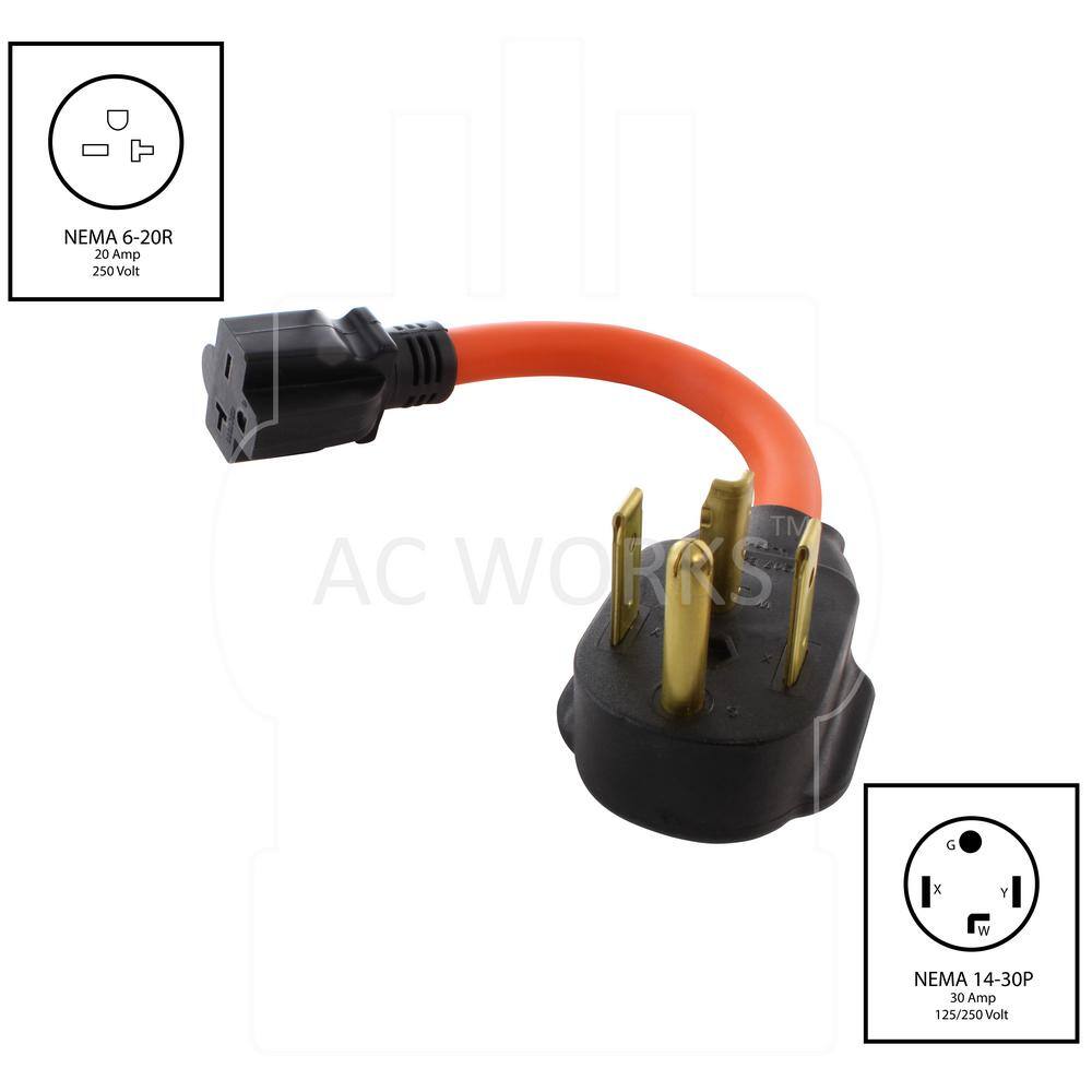 AC WORKS S1430620-012 10/3 STW 1 ft. 14-30P 30 Amp 4-Prong Dryer Plug to 6-15/20R 20 Amp 250-Volt T Blade Connector This AC WORKS brand dryer outlet adapter [S1430620-012] is very durable. It is a NEMA 14-30P to NEMA 6-20R. The NEMA 14-30P is a 30 Amp, 125/250 Volt, 4-prong dryer male plug. The NEMA 6-20R is a 15/20 Amp, 250 Volt, female connector. The cable is an STW, 10/3, 600 Volt jacket with a 30 Amp copper wire. The maximum operating power is 5000 Watts. Included in your purchase is a 5-year limited warranty. NEMA 14-30P to NEMA 6-15/20R NEMA 14-30P, 30 Amp, 125/250 Volts, 4-Prong Male Plug NEMA 6-20R, 15/20 Amp, 250 Volt, T-blade Female Connector Maximum Operation Wattage 5000 Watts 5-Year Limited Warranty Additional Resources From the Manufacturer Warranty