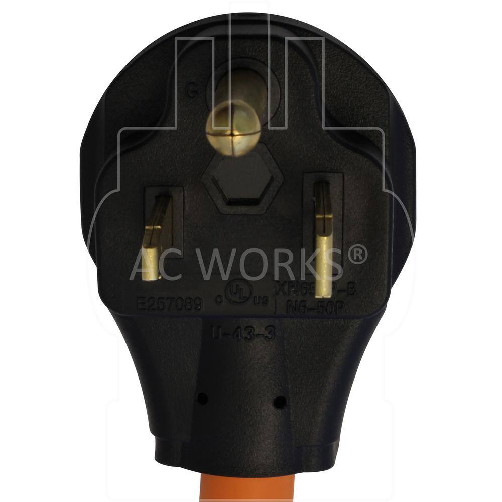 AC WORKS S650CB620 1 ft. 50 Amp 3-Prong 6-50P Welder Plug to 6-15/20 Outlet with 20 Amp Breaker This AC WORKS brand protective adapter [S650CB620] is a heavy-duty adapter cable. This 1-foot cord is a NEMA 6-50P to NEMA 6-15/20R. The NEMA 6-50P is a 50 Amp, 3-prong, welder plug. The NEMA 6-15/20R is a 15/20 Amp, T-blade, 250 Volt, female connector. The cable is an STW, 10/3, anti-cold weather cable staying flexible in extreme temperatures. The cord is super durable and typically used with construction and industrial equipment. Included with your purchase is a 5-year limited warranty. NEMA 6-50P to NEMA 6-15/20R with 20 Amp Breaker NEMA 6-50P, 50 Amp, 250 Volt Welder Plug NEMA 6-15/20R, 20 Amp, 250 Volt Female Connector with 20 Amp Breaker The Breaker is Designed to Trip Power when Drawing More than 20 Amps Anti-Cold Weather Cable Staying Flexible in Extreme Temperatures 5-year Limited Warranty Additional Resources From the Manufacturer Warranty