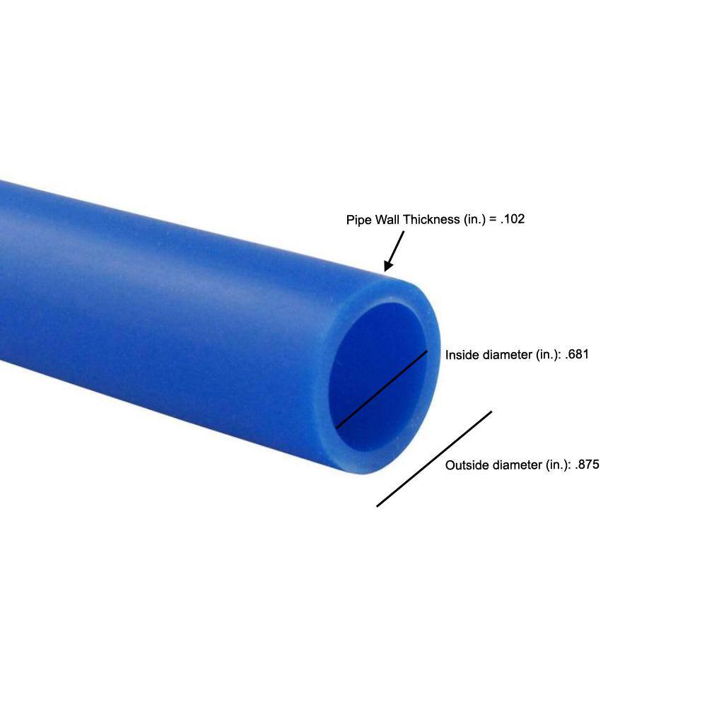 Apollo APPB30034 3/4 in. x 300 ft. Blue PEX-B Pipe ApolloPEX is cross-linked polyethylene tubing designed for use within potable water piping systems. ApolloPEX Pipe provides superior durability, corrosion resistance and flexibility for the most demanding environments. ApolloPEX is available in red, white and blue for the simple identification of cold water, hot water and main water lines. The ApolloPEX system is a comprehensive piping system comprised of brass fittings, poly alloy fittings, manifolds, valves, fasteners, tools and tubing designed for implementation in water delivery systems, simple or complex. Superior flexibility reduces the number of fittings required for installation which also reduces leak points within piping systems Durable and corrosion resistant pipe endures most installation environments Suitable for wet or dry installations and immediate pressure testing Compatible with ApolloPEX system fittings and tectite by Apollo push-to-connect fittings Listed to NSF 14 and CSA B137.5 for use in potable water distribution piping systems Center-pull coil speeds installation Available in coils (100 ft. – 500 ft.) and sticks (2 ft. – 20 ft.) some sizes special order only Pressure & Temperature: 160 psi @ 73° F, 100 psi @ 180° F Designed, manufactured and tested to meet or exceed the requirements of ASTM F-876/877/2023 and CSA B137.5 The tubing may be installed in concrete, gypsum based lightweight concrete, sand, asphalt, in or under wood flooring, or behind wallboard or plaster Type B cross-linked polyethylene Dimensions Actual inside diameter (in.) 0.681 Actual outside diameter (in.) 0.875 Nominal Inside Pipe Diameter (In.) 3/4″ Pipe Wall Thickness (In.) 0.102 Product Length (ft.) 300 ft Details Application Potable Water Color Family Blue Color/Finish Blue Connectivity Barb Material Cross-Linked Polyethylene (PEX) Maximum Flow Rate (gallons per minute) 4.6 Maximum working pressure (psi) 160 Maximum Working Temperature (F) 200 Minimum working temperature (F) 32 Pack Size 1 PEX Type B Pipe Features Corrosion Resistant, Flexible Pipe or Fitting Product Type Pipe & Tubing Product Weight (lb.) 31.10 lb