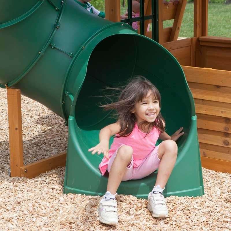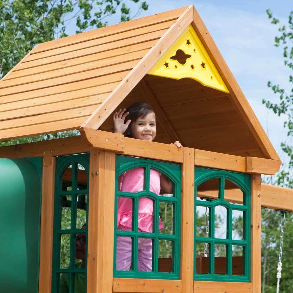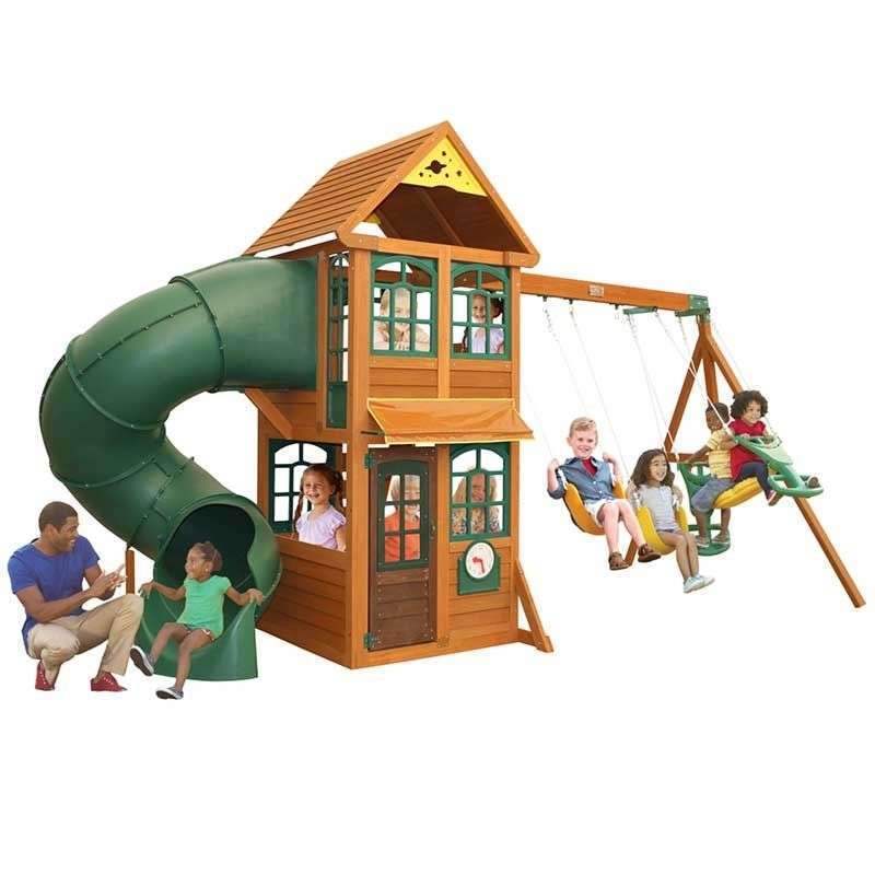 Picture a two-level playhouse with its giant super-slide and swing set to boot. Now picture enough fun activities to entertain ten kids at once. Put them together and you have the mighty, multitasking Cloverdale Wooden Swing Set. The two classic belt swings would’ve been plenty of fun, even without the premium glider that seats one or two. And they could have left out the play clock with moveable hands or the chalkboard tarp. But that’s just not us. They even added a few nice things for grownups—like 100% premium cedar lumber and sturdy, pre-assembled panels that make assembly easier.