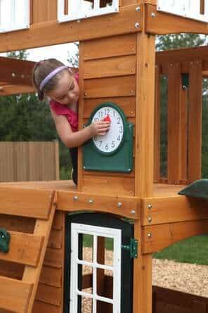 You will love the compact configuration of this all-in-one Cranbrook Wooden Swing Set Combo. Up to eleven imaginative kids can explore all that the Cranbrook Wooden Swing Set has to offer at a single time. And what child could resist the thrill of the high-rail wave slide or the challenge of climbing the multi-colored rock wall ladder to the upper-level clubhouse? A swing across the monkey bars offers additional access to the upper level, where a gabled shiplap roof provides a shady spot for the retreat. Downstairs, kids can take a ride on the two belt swings or share a jaunt on the premium glider. And snack time just steps away, served up from the lower clubhouse’s large café window, opening onto the built-in table and bench. Crafted from premium cedar lumber with design details like premium pane windows with arched pediments and decorative gable trusses, Cranbrook makes an attractive backyard addition adults will love, too. For big-crowd entertainment with a smaller footprint, count on Cranbrook.