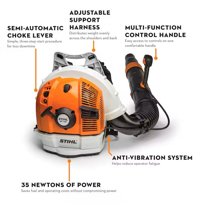 The STIHL BR 700 is a high output professional blower able to clear piles of wet leaves and reduce bottom-line costs with its fuel-efficient engine. Professionals will love the adaptive design features, including an adjustable telescopic tube to accommodate users of different heights, as well as the control handle that quickly adjusts with the snap of a lever, no tools required, to provide the most comfortable position. For further convenience, this blower comes with a semi-automatic choke for smooth and easy starts. Designed with an optimal power-to-weight ratio, the BR 700 combines power and portability so you can get the job done whenever, wherever.