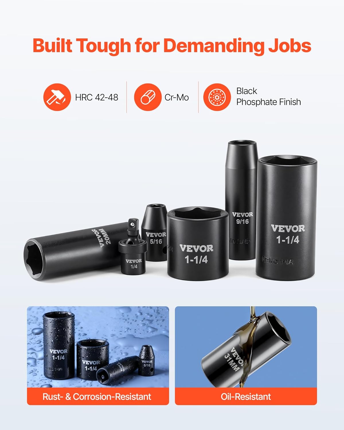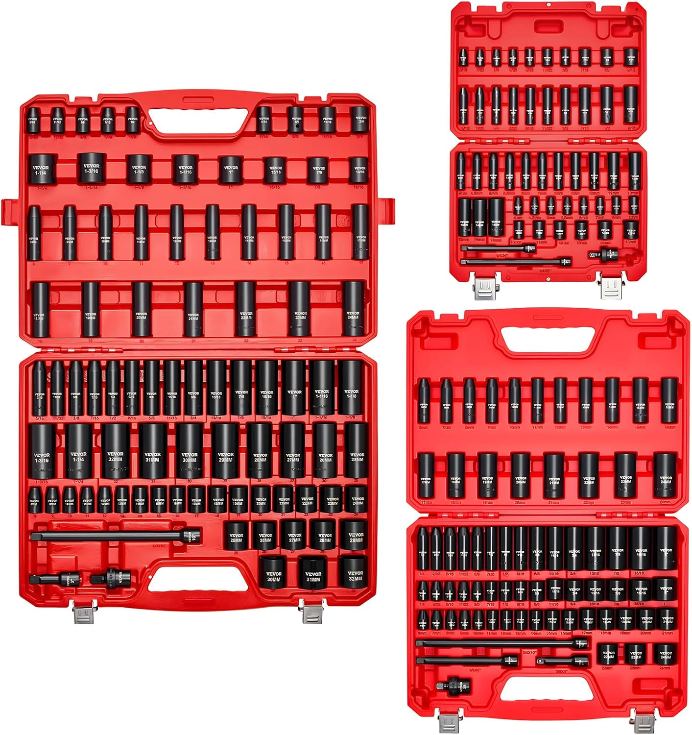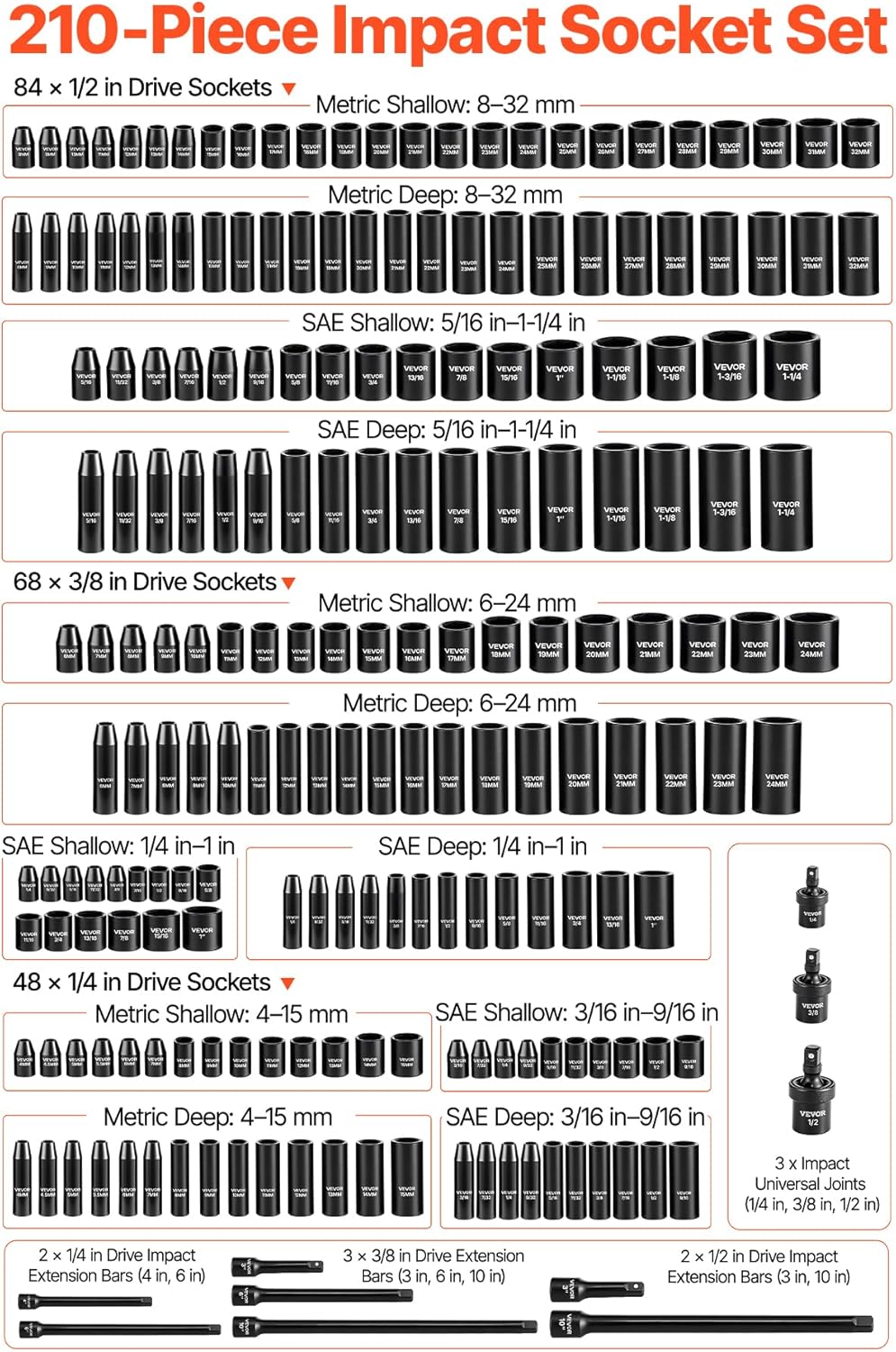 VEVOR 1/4 & 3/8 & 1/2 Inch Drive Impact Socket Set, 210-Piece Metric and Standard Full Sockets, Deep & Shallow, CR-V, 6 Point, Extension Bars, Universal Joint, Three Carrying Cases Durability You Can Trust: Crafted from premium Cr-Mo alloy steel and heat-treated for extra toughness, this impact socket set handles high-impact torque without damaging. The black phosphate finish shields against water, oil, and rust Enhanced Repair Efficiency: The 6-point socket design increases contact area with fasteners for a stronger grip. This reduces wear, avoids rounding of corners, and ensures bolts stay locked in place—even when using high-torque impact wrenches Easy-to-Read Size Markings: With laser and stamped markings, this impact socket set allows you to quickly identify the right size, even in low-light environments such as car undercarriages. The stamped design resists wear for long-lasting readability Effortless Storage & Portability: A sturdy carrying case keeps your impact socket set neatly organized and secure. Compact enough to fit in your trunk or machinery storage compartments, just pop it open on-site and grab the exact size you need Comprehensive 210-Piece Set: This impact socket set includes 48 x 1/4 in drive sockets (Metric shallow & deep sockets: 4 to 15 mm, SAE shallow & deep sockets: 3/16 in to 9/16 in). 68 x 3/8 in drive sockets (Metric shallow & deep sockets: 6 to 24 mm, SAE shallow & deep sockets: 1/4 in to 1 in), 84 x 1/2 in drive sockets (Metric shallow & deep sockets: 8 to 32 mm, SAE shallow & deep sockets: 5/16 in to 1-1/4 in), multiple impact extension bars, and three impact universal joints Brand ‎VEVOR Material ‎Chrome Vanadium Steel Finish Type ‎Black Phosphate Finish Number of Pieces ‎210 Drive System ‎Hex UPC ‎197988170075 Manufacturer ‎VEVOR Part Number ‎69300008 Item Weight ‎60.4 pounds Package Dimensions ‎17.72 x 15.75 x 13.78 inches Item model number ‎69300008 Color ‎Red & Black Style ‎1/2″ & 3/8″ & 1/4″ 210PCS Finish ‎Black Phosphate Finish Item Package Quantity ‎1 Batteries Required? ‎No