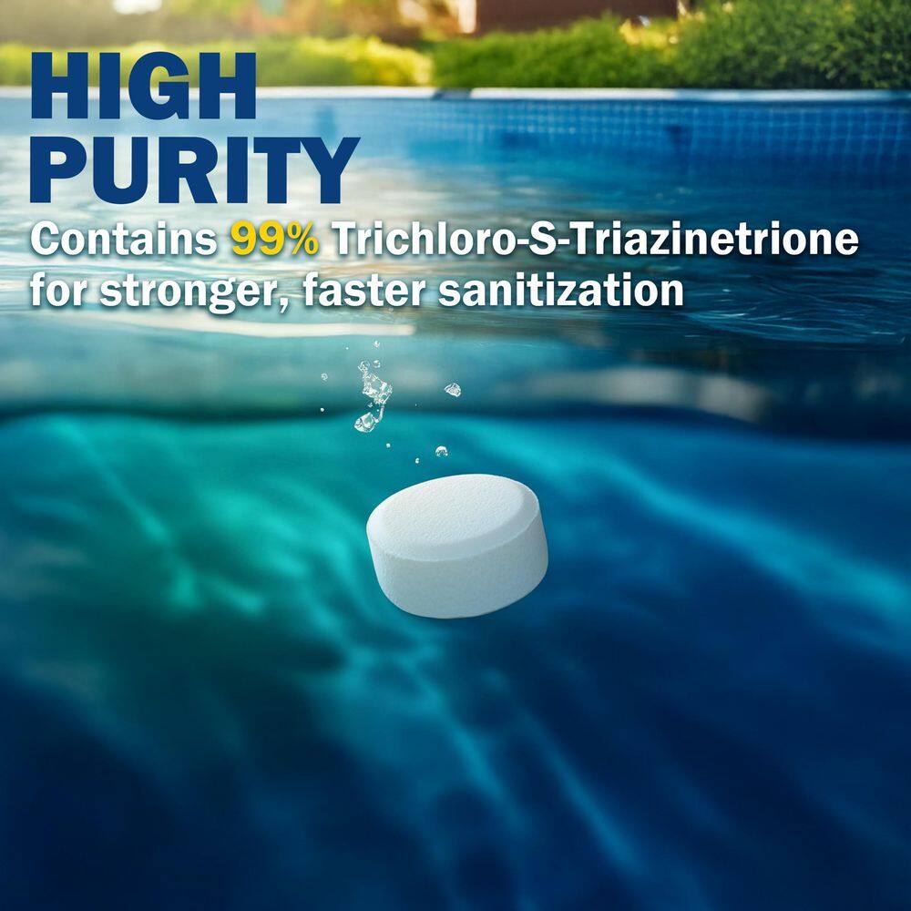 XtremepowerUS 71103-H 25 lbs. 3 in. Pool Chlorinating Individually Wrapped Tablets Introducing our premium pool sanitizing solution – a powerhouse of purity for your aquatic haven, Immerse your pool in the unrivaled efficacy of our Stabilized Chlorine Tablets, meticulously crafted with an extraordinary 99% Trichloro-S-Triazinetrione content. Packed with a formidable 90% concentration of Available Stabilized Chlorine, these slow-dissolving tablets ensure a consistent release, maintaining crystal-clear waters with ease. These tablets seamlessly integrate into your pool maintenance routine, whether via floating feeders, skimmers or automatic chlorinators. Our product offers unparalleled versatility, providing a robust defense against impurities. Elevate your pool experience with the reliability and excellence embodied in every tablet – because your aquatic sanctuary deserves nothing but the best. High Trichloro-S-Triazinetrione content: formulated with an impressive 99% Trichloro-S-Triazinetrione, ensuring potent and effective pool water sanitation Robust stabilized chlorine: boasting a significant 90% concentration of available stabilized chlorine, providing enduring and reliable disinfection for your pool Stabilized (slow dissolving) tablets: designed as slow-dissolving tablets, these pool sanitizing agents deliver a consistent release of chlorine over time, contributing to a stable and well-maintained water environment Individually wrapped tablets: each tablet is meticulously wrapped individually, ensuring convenient handling and preserving the integrity of the product until use Versatile application: excellent for use in various pool maintenance systems, including floating feeders, skimmers and automatic chlorinators, providing flexibility and convenience in maintaining your pool’s chlorine levels Enhanced features collectively make this product an exceptional choice for those seeking a reliable and efficient solution for pool water sanitation Dimensions Container Size (oz.) 400 oz Product Depth (in.) 11 in Product Height (in.) 13.5 in Product Width (in.) 11 in Details Outdoor Living Product Type Pool Chlorine Pack Size 1 Pool Chemical Type Chlorine Product Form Tablets Product Weight (lb.) 25 lb Additional Resources From the Manufacturer Warranty