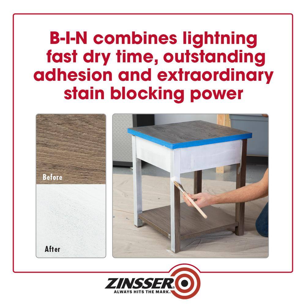 Zinsser 00904 1 qt. B-I-N Shellac-Based White Interior Primer and Sealer (6-Pack) Zinsser 1 qt. B-I-N Shellac-Based White Interior/Spot Exterior Primer and Sealer (Case of 6) can be used in low temperatures and sticks to any surface without sanding. The primer seals stain from water, smoke and fire damage. It also stops bleeding knots and sap streaks. Great for interior use in ceilings, walls, doors, trim, cabinets, furniture and more and spot priming on exterior surfaces Covers up to 100 sq. ft. Flat/matte white finish Shellac based formula blocks odors permanently and completely and seals severe stains from water, smoke, fire damage and more Permanently seals odors from fire and smoke damage, mold and mildew, cigars and cigarettes, pet urine and more Excellent adhesion to glossy surfaces without scuff sanding, permanent stain blocker for severe stains and odors Dries to the touch in 20 minutes Clean up spills and drips with denatured alcohol Dimensions Container Size 1 Quart Details Application Sealer Application Method Brush, Paint Sprayer, Roller Base Material Shellac Coating Product Category Primer Color Family White Color/Finish White Coverage Area (sq. ft) 100 Dry to Touch (min.) 30 min Interior/Exterior Interior Number of coats recommended 1 Number per Package 6 Paint Product Form Liquid Paint/Stain Clean Up Mineral Spirits Paint/Stain Features Sealer Primer Purpose Color Changing, Odor Blocking, Stain Blocking Sheen Flat Surface Material Use Concrete/Brick/Masonry/Stone, Drywall, Metal, Wood Additional Resources From the Manufacturer SDS Use and Care Manual