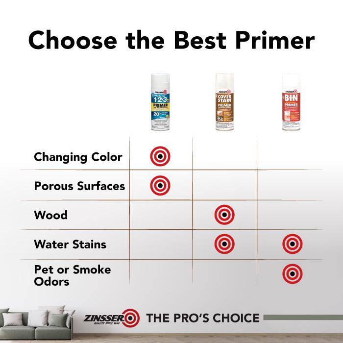 Zinsser 272479 Bulls Eye 1-2-3 Plus 13 oz. White Interior/Exterior Primer Spray (6-Pack) Zinsser Bulls Eye 1-2-3 Plus 13 oz. Flat White Interior/Exterior Primer Spray is an all-purpose, high performance primer designed to block all water and oil base stains. Advanced Technology primer prevents blistering, peeling and inhibits rust. Excellent adhesion, sticks to various surfaces including glossy materials, chalky siding, masonry and metal. Takes the guesswork out of primer selection. Ideal for interior and exterior applications Ensures longer life of top coats Covers up to 15 sq. ft. White smooth finish is great under any topcoat Completely blocks all stains – water, tannin bleed, smoke and more Dries to touch in just 30-minutes, allowing projects to be completed quickly Advanced technology oil based formula penetrates and seals porous surfaces Clean up with mineral spirits Online Price includes Paint Care fee in the following states: CA, CO, CT, MN, OR, RI, VT Dimensions Container Size 13 Ounce Details Application Masonry, Stucco & Brick Application Method Aerosol Base Material Oil Based Coating Product Category Primer Color Family White Color/Finish White Coverage Area (sq. ft) 15 Dry to Touch (min.) 30 min Interior/Exterior Exterior, Interior Kit No Number per Package 6 Paint Key Features Inverted spray ability Paint Product Form Spray Paint/Stain Clean Up Mineral Spirits Primer Purpose Color Changing, Odor Blocking, Stain Blocking Sheen Flat/Matte Surface Material Use Galvanized Metal, Masonry Transparency Solid Additional Resources From the Manufacturer SDS Use and Care Manual