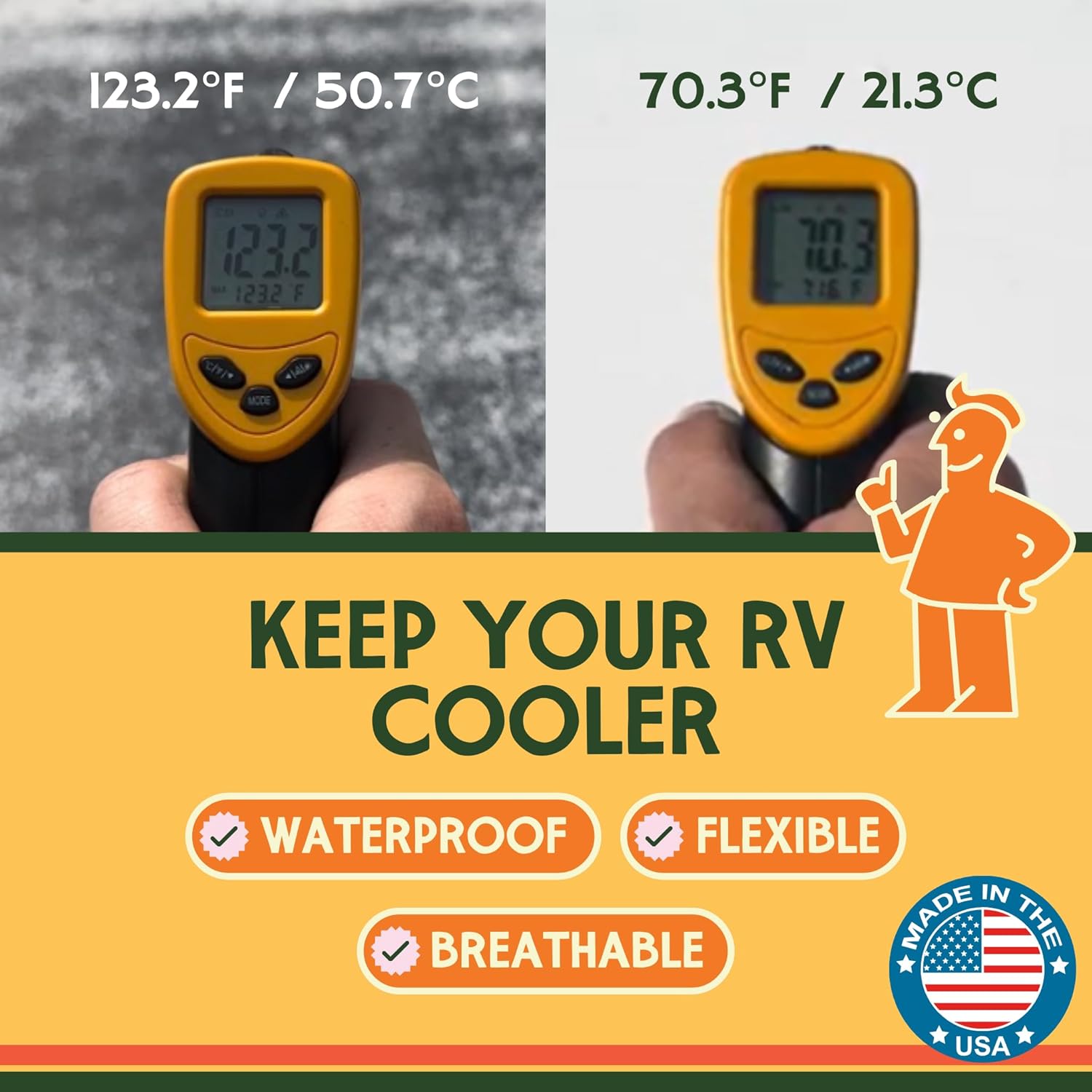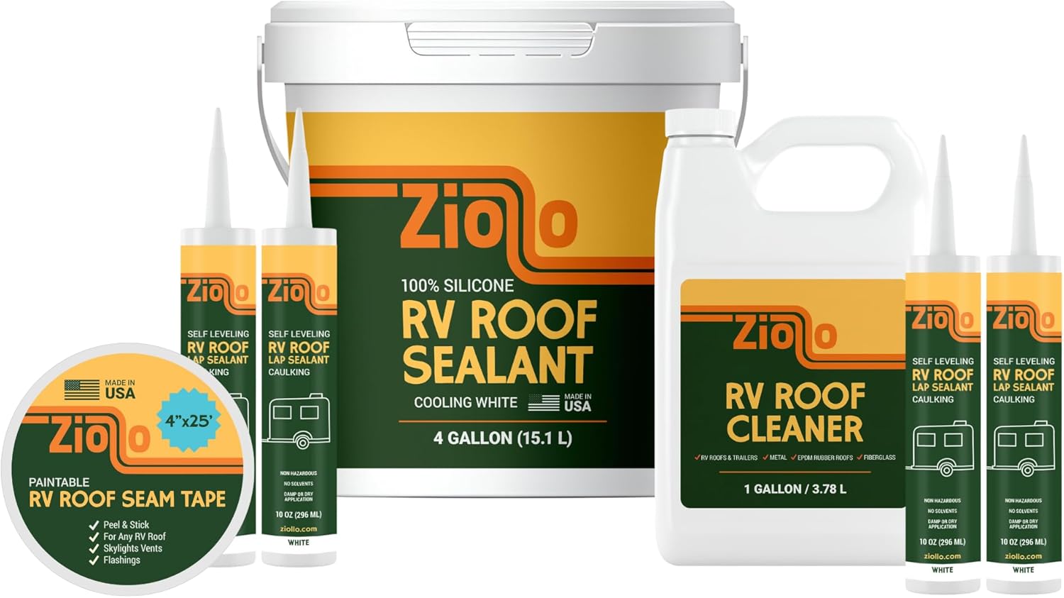 Ziollo RV 30 ft Roof Repair Kit – Roof Repair Kit to Seal and Waterproof, Bond to EPDM Rubber with Sealant (1 Paintable Tape, 4 pk Caulking, 1 Cleaner and 4G Silicone Pail) KIT INCLUDES – 1 Reapir Seam Tape 4” x 25′ with Roller, 4 x 10oz Tubes of Self Leveling Caulking Lap Sealant, 1G Roof Cleaner and 1 4G Silicone Pail CAMPFIRE TALES, NOT ROOF FAILS — Remember when your biggest worry was running out of marshmallows—not dealing with a leaky roof? Our 100% silicone liquid rubber RV roof sealant makes fixing your RV roof easy. It creates a strong, permanent, and waterproof layer on EPDM rubber, TPO, metal, wood, and fiberglass—all in just ONE COAT, with NO PRIMER needed (except for TPO). Other products need multiple coats and take days to apply. Ours keeps it simple, saves you time, and gets you back to making memories—fast THE WEEKEND WARRIOR’S SECRET WEAPON — While others spend their Saturday on repairs, you’ll be hitting the road. Our self-leveling formula flows effortlessly across your roof, making application a breeze instead of a chore, covering 60 sq ft per gallon, on 4g pail will cover a 30ft rv. Whether you’re protecting a compact pop up camper or luxurious motorhome, you’ll be adventure-ready in no time BEATS THE SUMMER HEAT — Our highly reflective white coating creates a rubberized surface that drops interior temperatures by up to 15°F (8°C). No more sweaty card games or sleepless summer nights in your travel trailer. Plus, those pesky roof vents and seams stay sealed tighter than your bear-proof food container FLEX WITH YOUR ADVENTURES — From Death Valley heat to Alaskan cold, our coating moves with your camper, not against it. Unlike ordinary rubber paint that cracks faster than your family asking “are we there yet?”, our silicone formula remains flexible — making it perfect for winterizing and year-round wanderlust THE FULL ZIOLLO SYSTEM — Like a well-planned road trip, preparation makes all the difference. Start with Ziollo RV Roof Cleaner, reinforce trouble spots with Ziollo Paintable Seam Tape, or Ziollo RV Roof Tape, Ziollo Lap Sealant, and for stubborn TPO roofs, our TPO Primer ensures perfect adhesion. Simply roll, brush or spray on when you’re ready. Backed by our 10-year warranty, so you can focus on making memories instead of making repairs Product information Technical Details Material Silicone Brand Ziollo Style Silicone Compatible Material Epdm Rubber, Tpo, Metal, Wood, Fiberglass Water Resistance Level Waterproof Item Form Liquid UPC 628011233707 Unit Count 7.0 Count Number of Items 1 Color Cooling White Manufacturer Ziollo Model 23370 Country of Origin USA Item model number 23370 Manufacturer Part Number 23370