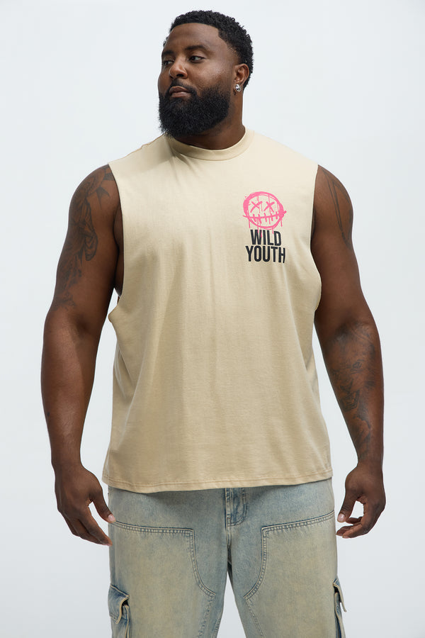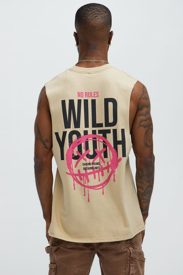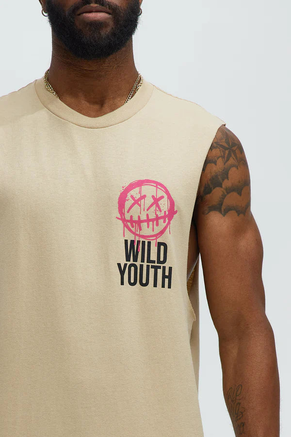 Stay cool and carefree with the Wild Youth Sleeveless Muscle Tee. Made from soft 100% cotton, this apricot crew-neck tee features a bold screen print and a relaxed fit, perfect for beach days, summer outings, or casual everyday wear.